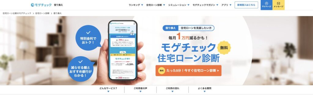 モゲチェック は住宅ローンの借り換えはもちろん、新規借入、住宅ローン診断や住宅ローンシュミレーションといったサービスが無料で利用できます。