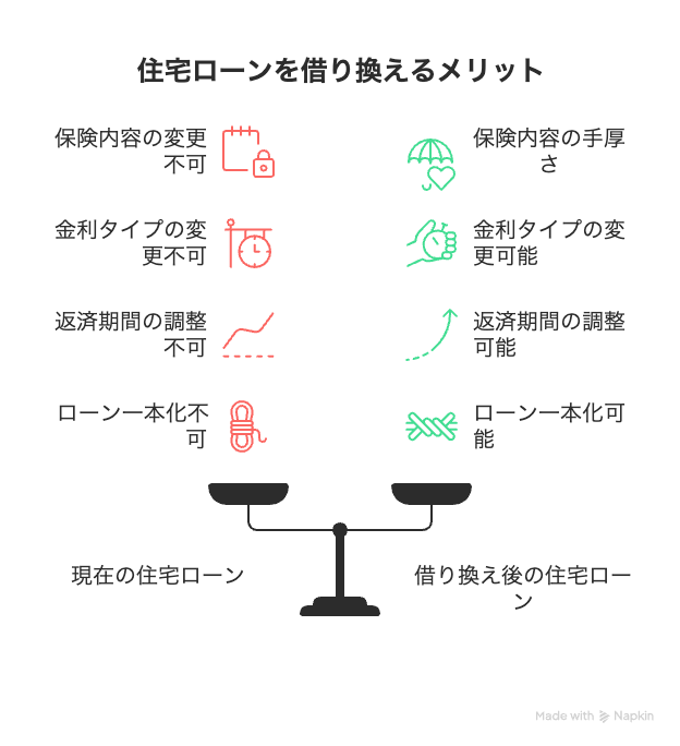 月々の返済額を抑えることができる、団体信用生命保険の保障内容が統一できるなど多くのメリットがあります。