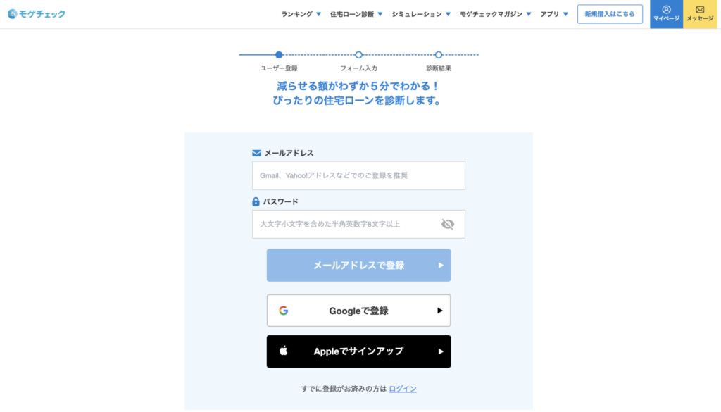面倒臭い方はもちろん、色々調べてから動きたい方も利用しやすいと思いますので是非、モゲチェックの住宅ローン診断を使ってみてください!