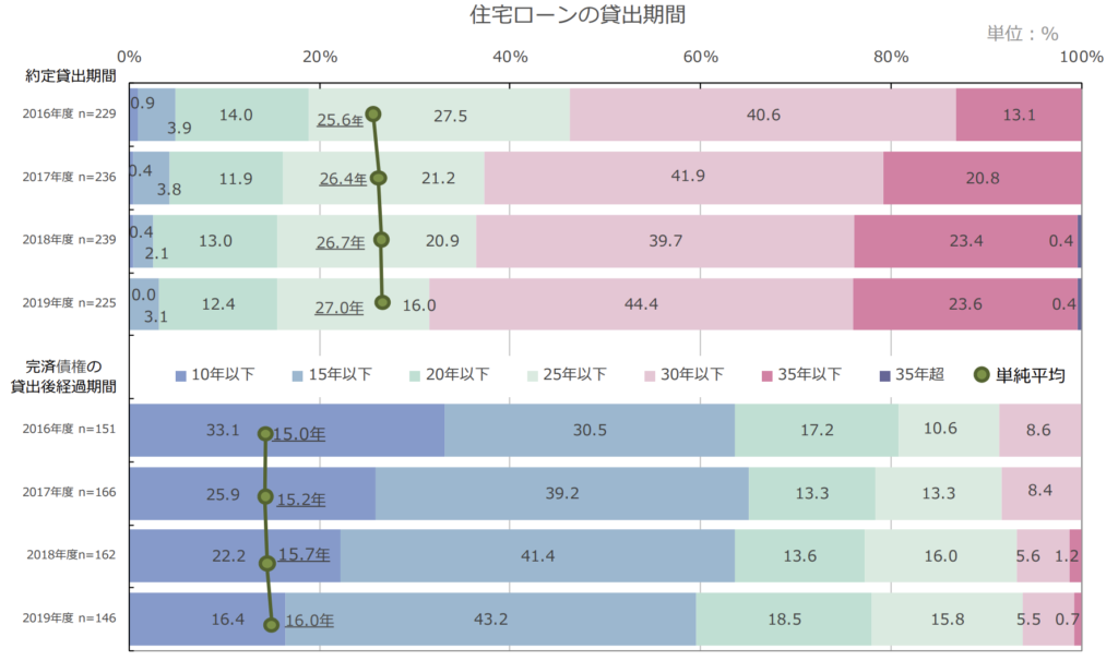2016年から2019年までを比較しても経過期間は15年〜16年と伸長傾向ではありますが、満期(30年や35年)まで返済されるケースは少ないと言えるでしょう。